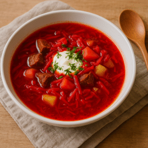 Borsch ucraniano con remolacha, col y carne. Sopa vibrante, ácida y reconfortante, ideal para servir caliente o fría.