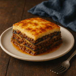 Moussaka griega con capas de berenjena asada, carne especiada y salsa cremosa gratinada al horno.