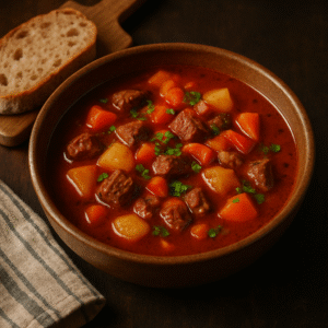 Sopa de goulash húngara con carne, papas y pimentón. Intensa, reconfortante y perfecta para días fríos.
