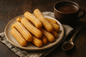 Churros caseros crujientes con chocolate espeso y caliente para mojar, un clásico irresistible español.