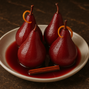 Peras enteras cocidas en vino tinto con especias, elegantes y llenas de aroma.